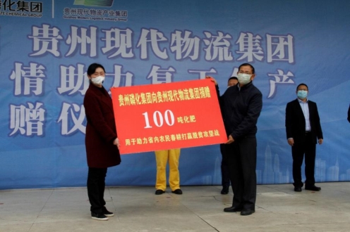 活动仪式上,贵州磷化集团向贵州现代物流产业集团子公司贵州蔬菜集团赠送100吨化肥。蔬菜集团党委副书记、副董事长、副总经理罗方平表示,这100吨化肥将重点用于支持全省“9+3”挂牌督战重点扶贫县的春耕生产,助力早日打赢脱贫攻坚。