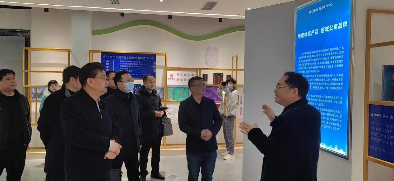 省国资委一行参观一楼贵州省品牌展览馆,省品促会理事长吴好学向其介绍展馆产品及入选标准