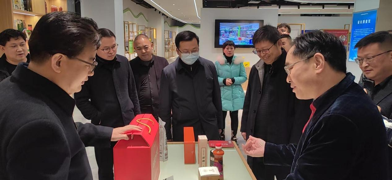 省国资委一行参观一楼贵州省品牌展览馆,省品促会理事长吴好学向其介绍展馆产品及入选标准