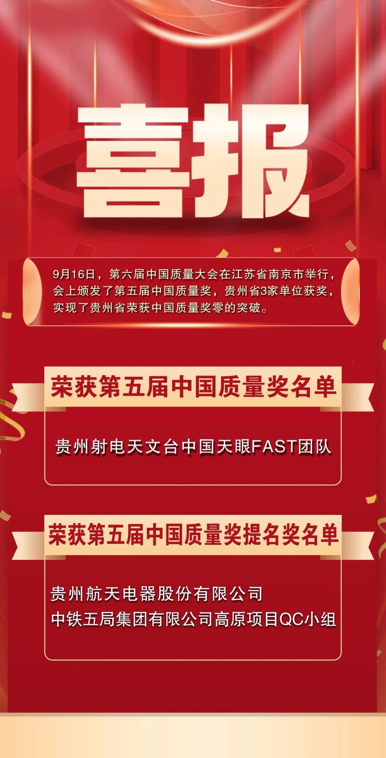 我国质量领域最高荣誉——第五届中国质量奖获奖名单正式公布,贵州射电天文台中国天眼FAST团队成功获奖,实现了贵州省在中国质量奖正奖上"零的突破",标志着贵州在质量建设发展方面取得了显著进步。